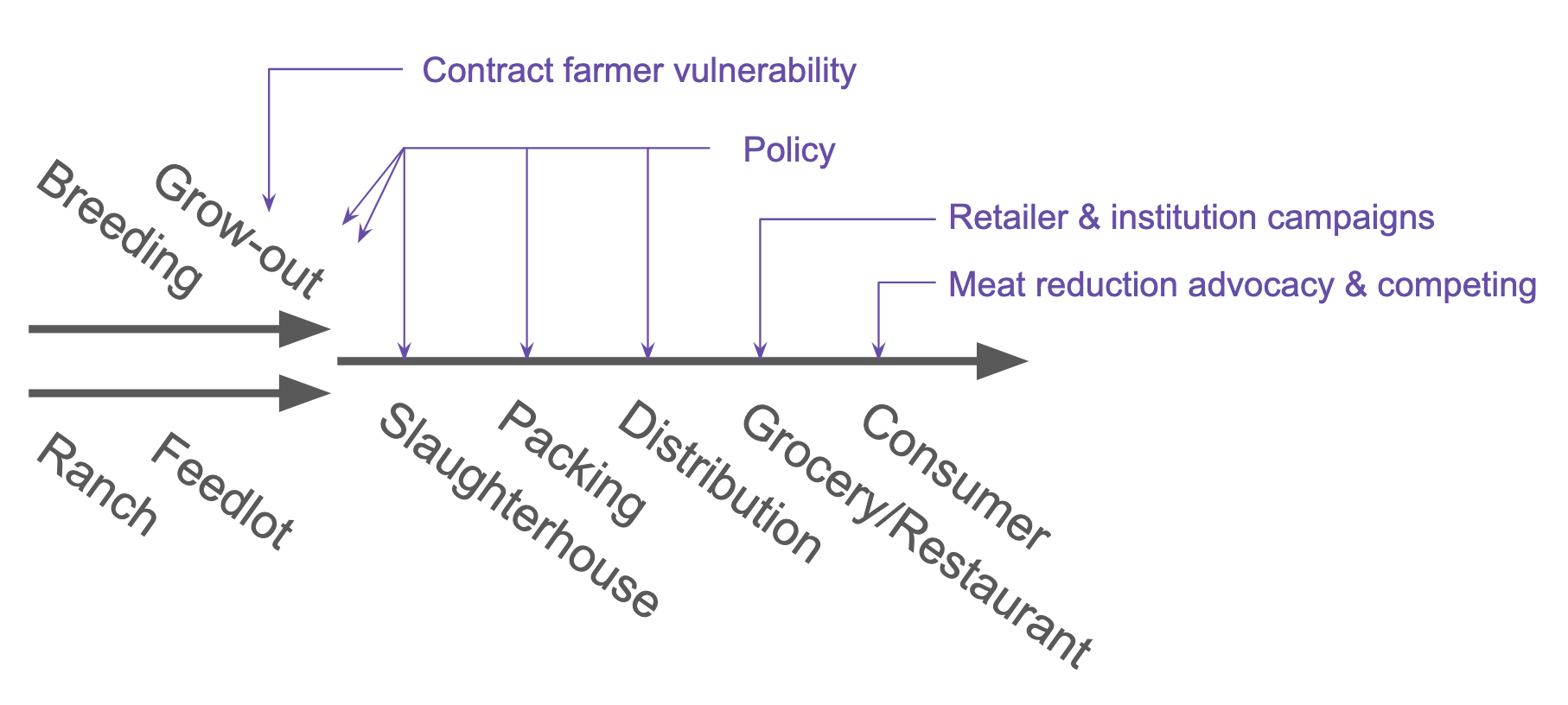 In all cases, from the slaughterhouse onwards there’s a highly concentrated meat supply chain owned and operated by a small set of companies (Tyson, Cargill, etc). They slaughter, butcher, pack, refrigerate and distribute to grocery stores and as such they have tremendous industry power.