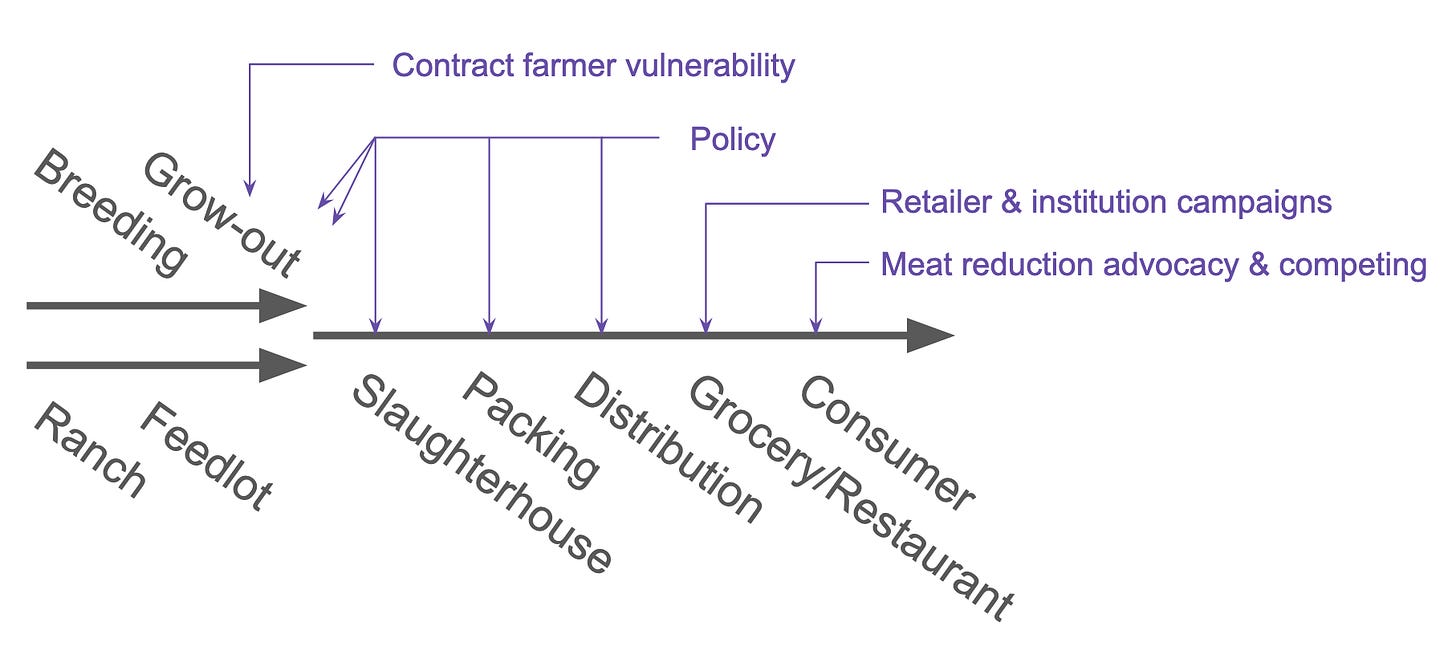 First, a huge portion of all these theories of change funnel through consumer demand in some form. Originally I thought consumer demand was only referring to what people actually choose to buy in the grocery store, but the map made me realize the demand actually cashes out in tons of other ways: which restaurants people go to, which grocery stores they shop at, where they send their kids to school, what conferences they attend, which politicians they elect and what policies they support. This makes me upweight ideas that involve convincing the public that we have a problem, even without making a specific ask.