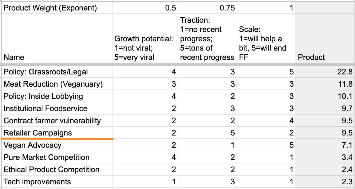 It’s very rough. You’re welcome to duplicate and mess with the scores and weights, if you want; I’ve bumped around until it roughly matched my intuitions, although Meat Reduction ended up higher than I expected. I think everything above and including “Retailer Campaigns” is above threshold for working on.